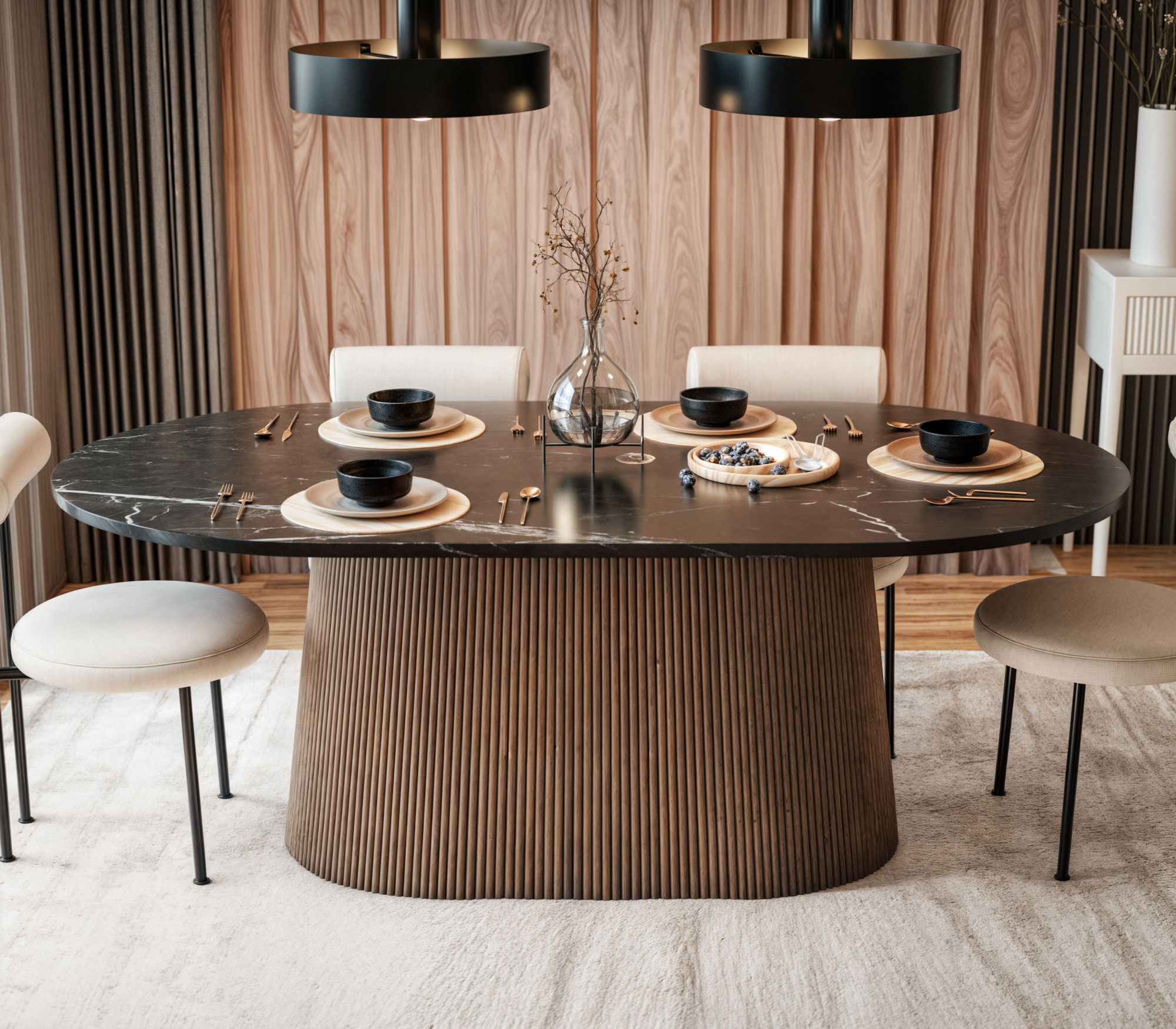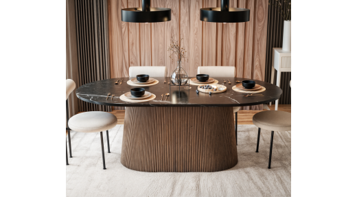 Stół „Verona” to wyrafinowane połączenie szlachetnego czarnego marmuru z ciepłym, brązowym wykończeniem drewna, tworzące elegancką i ponadczasową kompozycję. Owalny blat zachwyca wyrazistym rysunkiem kamienia z subtelnymi żyłami, które podkreślają jego unikalny charakter. Polerowana powierzchnia blatu dodaje mu luksusowego blasku i wyrafinowania.