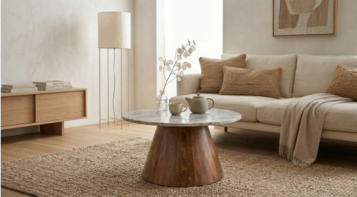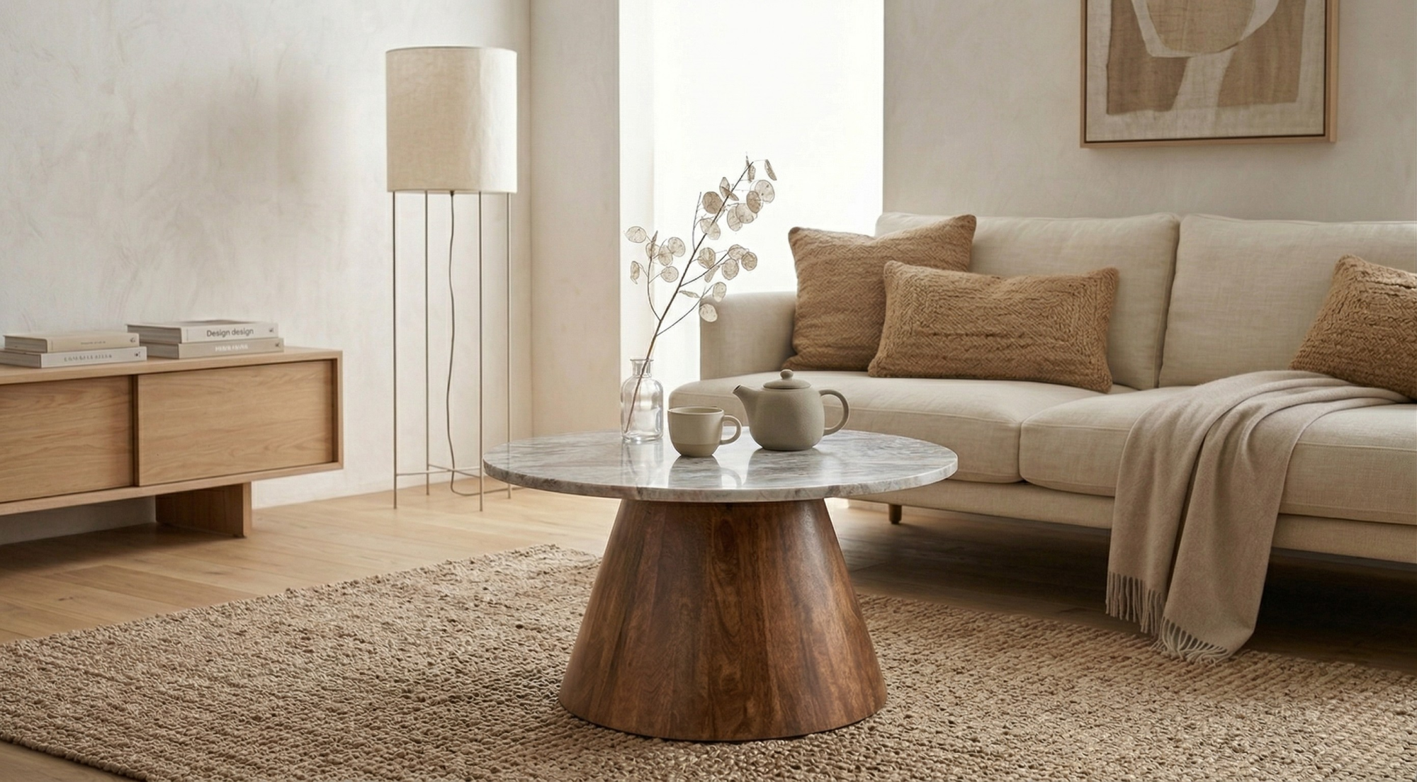 Masywny blat spoczywa na solidnej, stożkowej podstawie z litego drewna mango w brązowym wykończeniu. Kontrast między chłodem polerowanego kamienia a głębokim odcieniem drewna nadaje stolikowi wyjątkowej stabilności wizualnej i sprawia, że idealnie odnajduje się we wnętrzach typu modern classic, japandi oraz loft.
